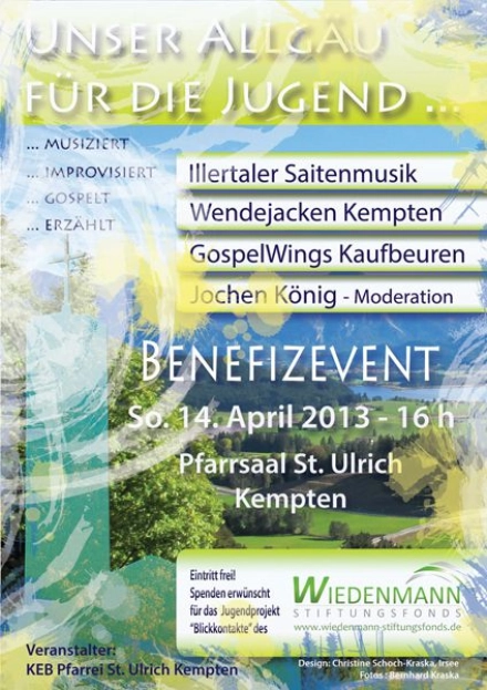 Am 14. April 2013 fand in Kempten das Benefizkonzert "Unser Allgäu für die Jugend" zugunsten des Wiedenmann-Stiftungsfonds für das Kemptener Jugendprojekte "Blickkontakte" statt.